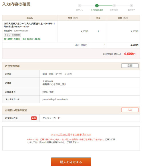 - 再度入力内容を確認しその内容でよろしければ、「購入を確定する」ボタンを押してください。